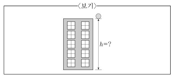 문 20. <보기>의 아파트 높이 h를 알기 위해 아파트 옥상에 올라가 물체를 초기속도 없이 연직 아래로 자유낙하 시켰더니 4초 후 바닥에 떨어졌다면 아파트의 높이 h[m]는?(단, 공기의 저항은 무시하고, 중력가속도는 9.8m/s²이다.)